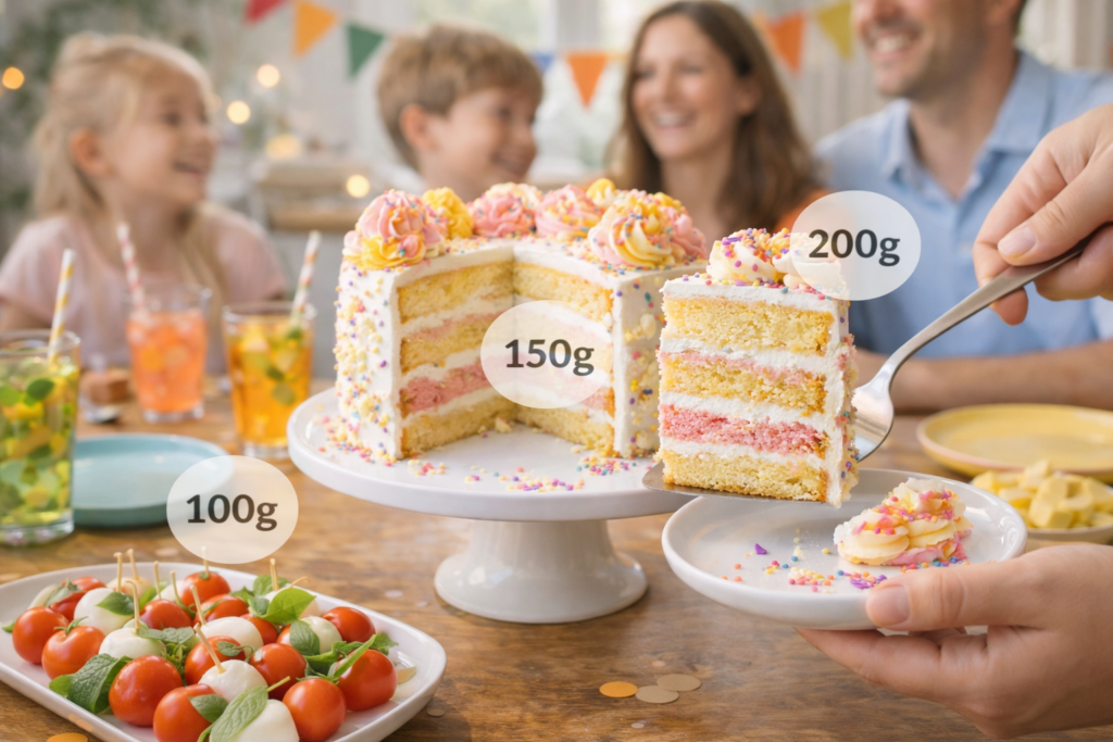 Como base geral, utiliza-se entre 80 g e 120 g de bolo por pessoa, dependendo do tipo de evento. Esse intervalo cobre a maioria das festas bem planejadas.